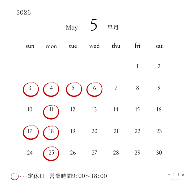 5月は第一日曜日、第三日曜日、月曜日の定休日に加えて、